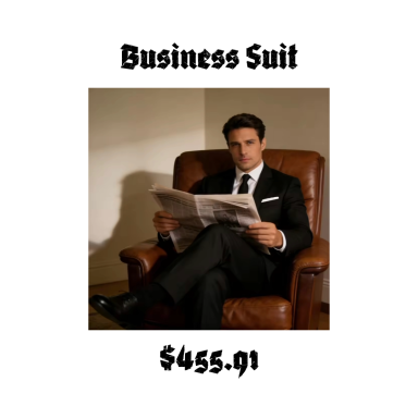 Two piece black business suit, includes jacket and slacks. Click on contact us for ordering or call us.