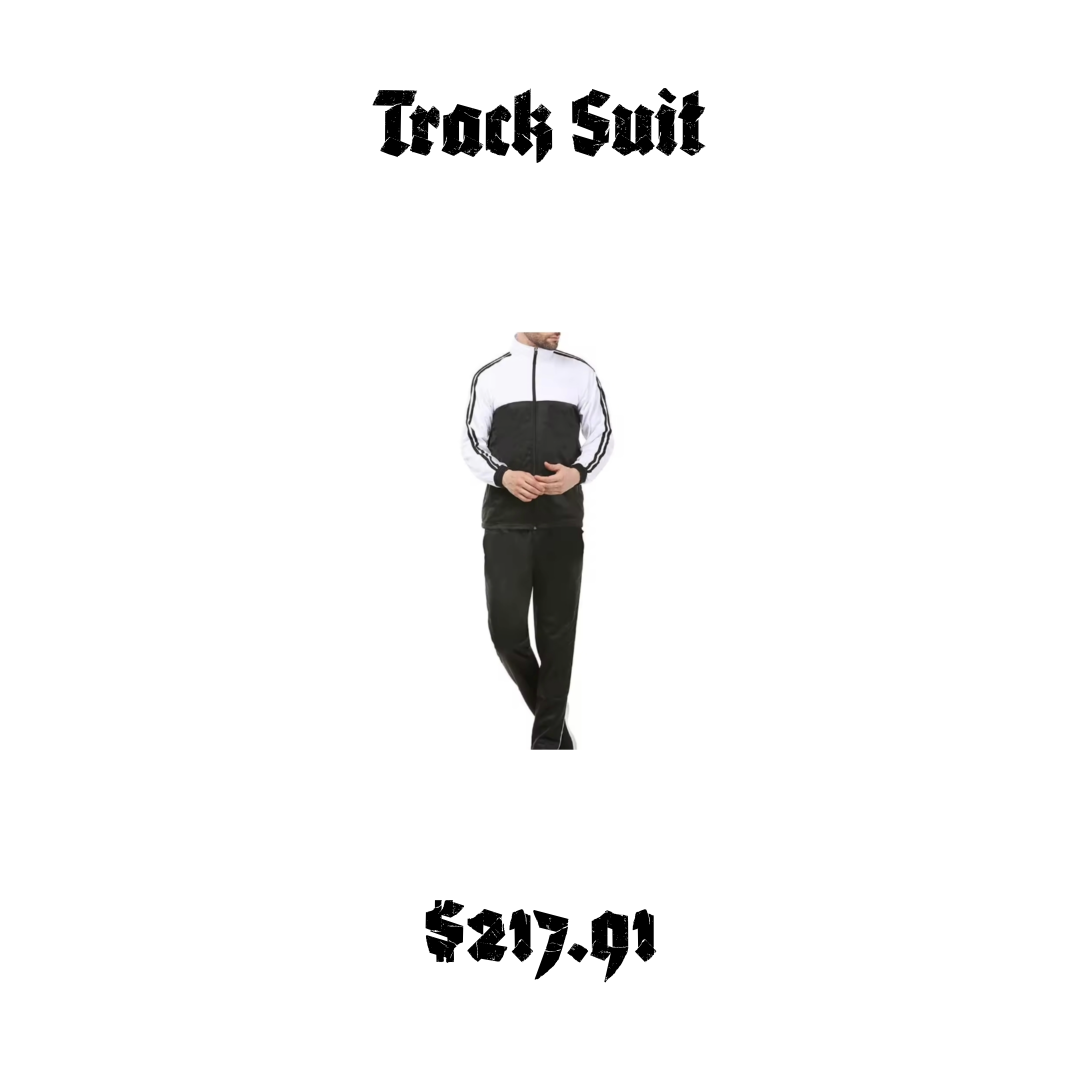New black and white tracksuit. Includes long sleeve shirt and pants. Click on contact us for ordering or call us.