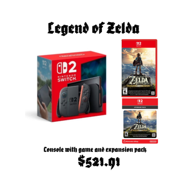 Nintendo Switch 2 Console with Legend of Zelda game and digital upgrade expansion pack. Epic game. Click on contact us to order.